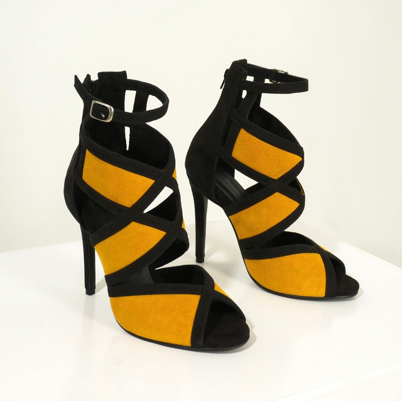 Sandalias fabricadas en material tipo gamuza, combinación de colores mostaza x negro, tacón de 9 cms, plataforma de 1 cms, incluyen platilla confort para mayor comodidad, verifica tu talla en la tabla de medidas que aparecen al final de las imágenes de muestra.