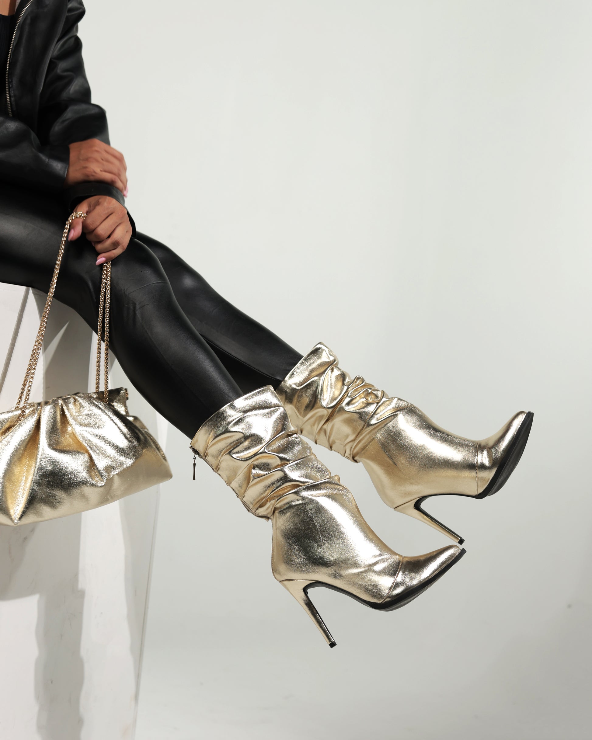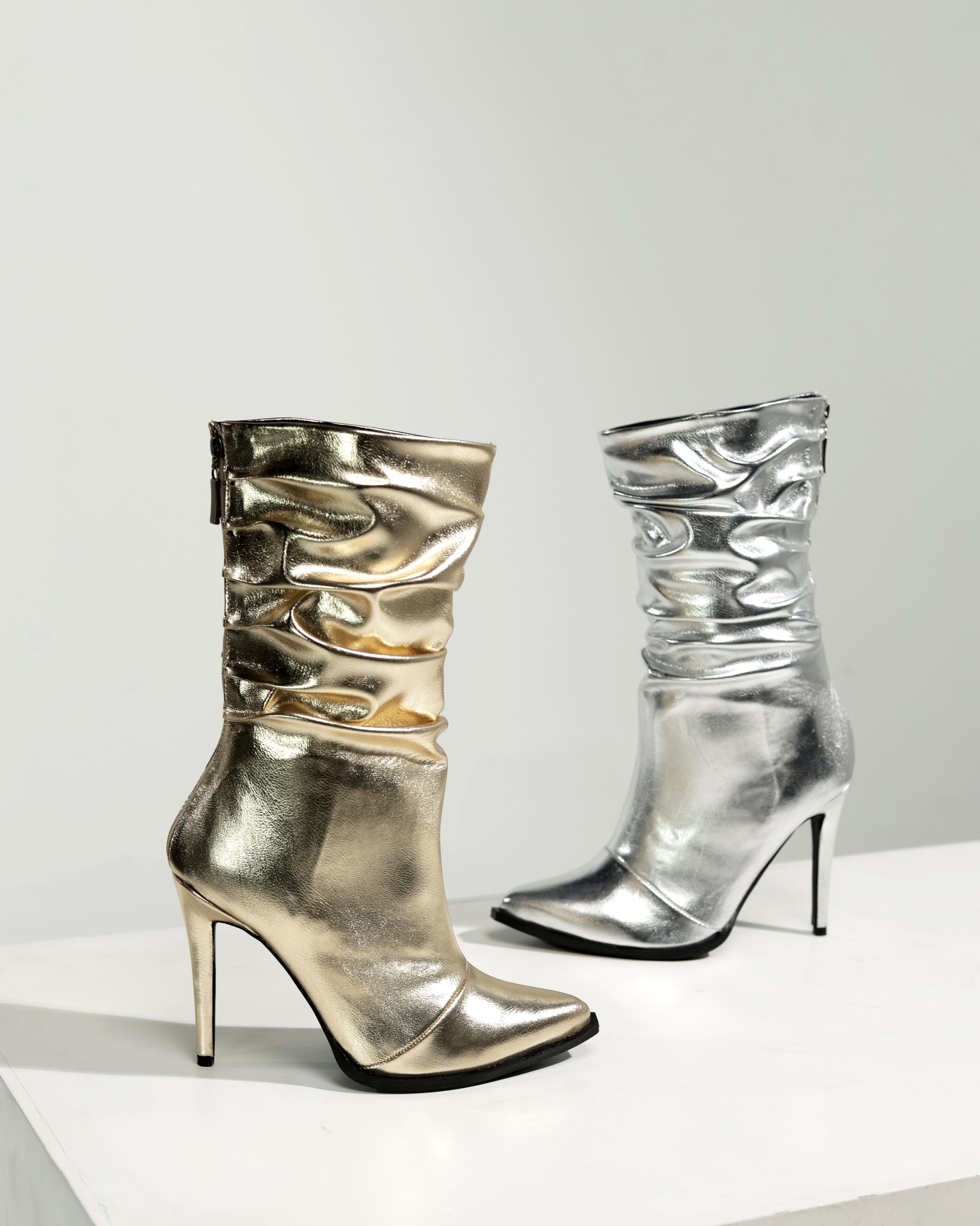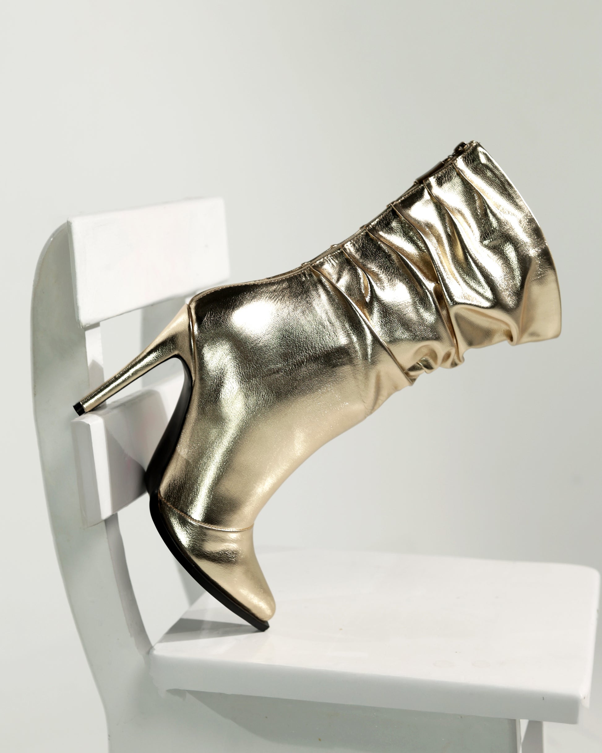 Botas fabricadas en material dorado con efecto arruga, tacón de 9 cms, plataforma interna de 1 cms, incluyen plantilla confort para mayor comodidad, verifica tu talla en la tabla de medidas que aparecen al final de las imágenes de muestra.